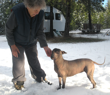 …of my favorite “Xolo Duenas.” Shirley Lundy is in her 80’s and still does rally and obedience training with her dogs. Here she is pictured with her standard hairless female Xolo, “Roca.” When I spoke with Shirley on the phone recently she expressed that she sends her love and best wishes to all her Xolo friends….and wishes that we could get together more often.