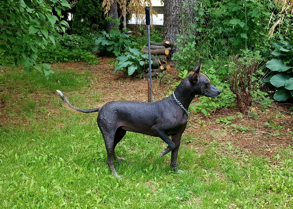 PAPA. birthdate 7/24/18. Almost 3years old. Spayed standard female hairless. Loves to walk. Needs a strong hand on leash, but with frequent walks will do well. Boisterous young lady. Thinks she is a puppy. Some skin issues. Crate trained. No cats.posted June 12.